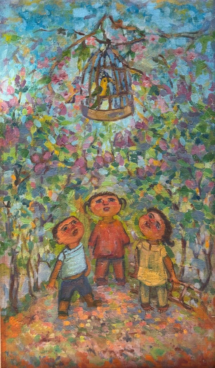 Картина маслом « Птица в цветущем саду»