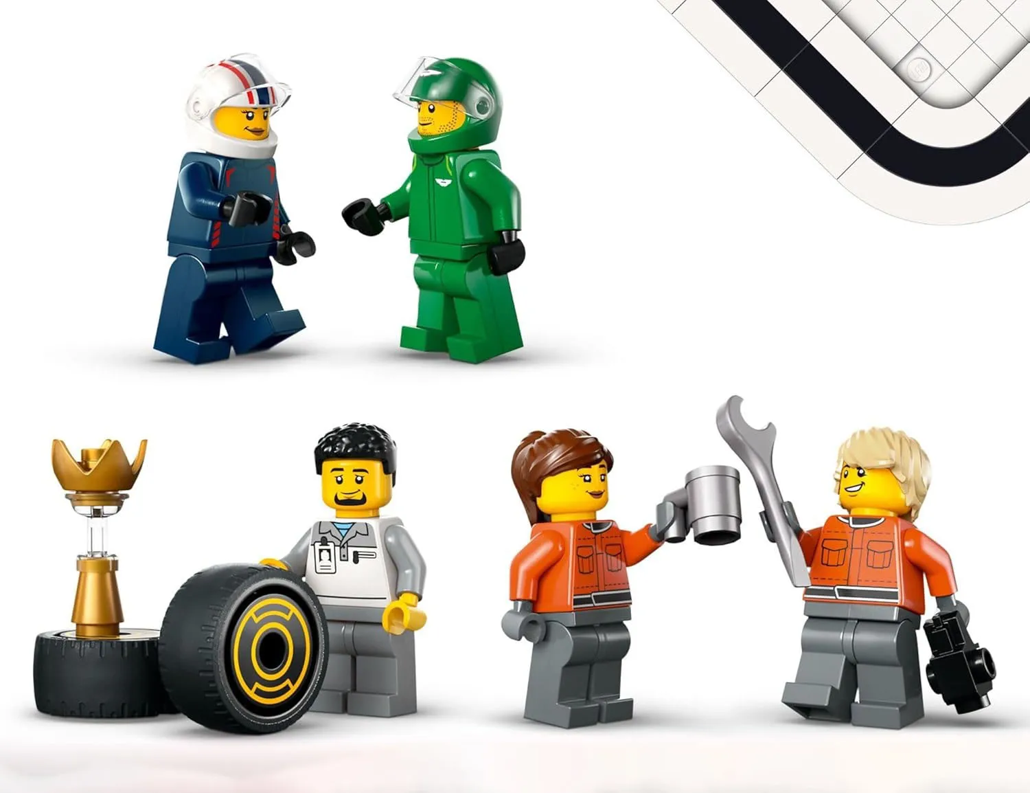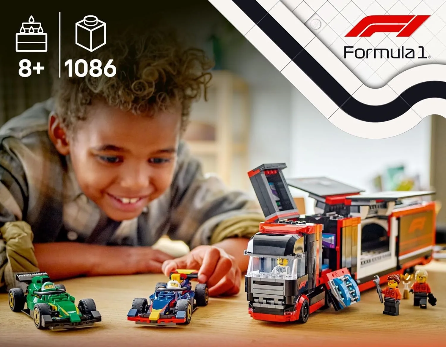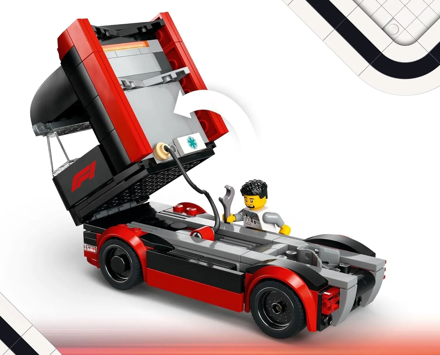 Конструктор LEGO City F1 Truck with RB20 & AMR24 F1 Car Toys посвящен гонкам Формула 1 и позволяет собрать большой грузовой автомобиль для перевозки болидов. Кабина откидывается, позволяя рассмотреть двигатель. Прицеп низкопрофильный, боковые панели поднимаются, что предоставляет свободный доступ и позволяет увидеть гоночные машины. Для ролевых игр в комплекте входят пять мини-фигурок: три члена экипажа и два водителя. Также сборка включает мини-комнату с симулятором гонок F1.