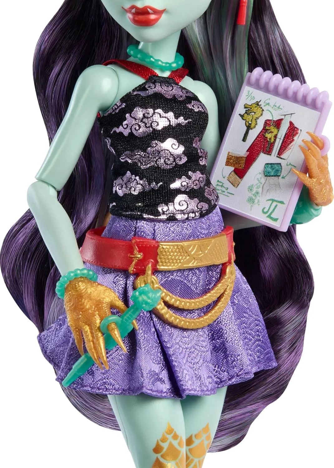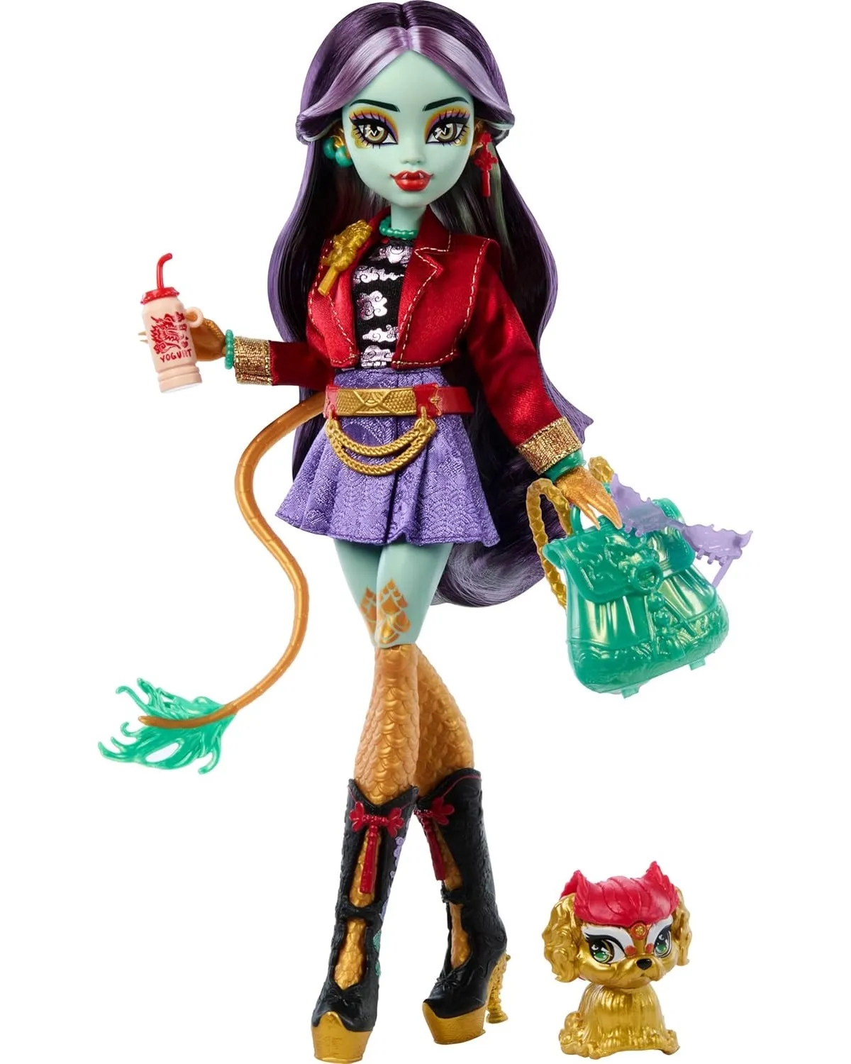 Кукла Monster High HYV58 — это Джинафайер Лонг, ученица Школы Монстров и дочь китайского дракона — она может дышать огнем. И, как и все ее подруги, она настоящая модница. На кукле — короткий бордовый жакет, мини-юбка фиолетового цвета, красный пояс с золотыми цепями и высокие черные сапоги. Образ дополняют разнообразные украшения и аксессуары: очки, браслеты и бусы. Также в набор входят блокнот для рисования, стакан с напитком, сиреневый рюкзак и фигурка питомца.