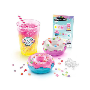 Включает: 1 чашка, 3 порошка слизи, 3 готовой слизи, 5 пакетиков с украшениями, 2 формочки для пончиков, 1 соломинка, 1 карточка с рецептами.